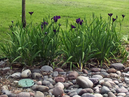 Back on the walk route we passed some pretty purple iris along a stream of river rock. |