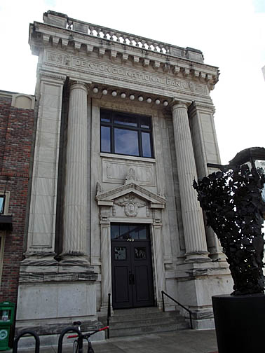 Old bank building from 1913 with a “Temple” design entrance. It has a marble veneer with huge columns. Above the entrance is some elaborate decorations. |