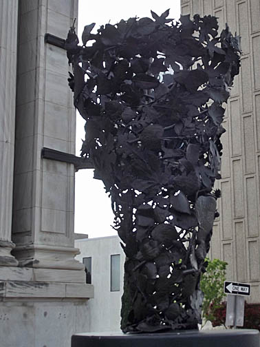 Bronze tornado of leaves, pine cones, and acorns by David C. Iles in front of the former bank. |